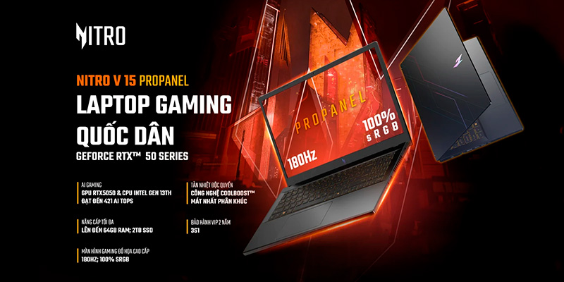 Máy được trang bị RAM 16GB DDR4 3200MHz (1x16GB) với khả năng nâng cấp lên tới 64GB, đảm bảo khả năng đa nhiệm mượt mà và xử lý hiệu quả các ứng dụng nặng. Ổ cứng SSD 512GB PCIe Gen 4x4 NVMe giúp máy khởi động nhanh, mở phần mềm tức thì và truy xuất dữ liệu cực kỳ nhanh chóng. Kết hợp giữa dung lượng lưu trữ lớn và tốc độ cao, Acer Nitro V 15 ProPanel mang đến hiệu năng ổn định và mượt mà cho mọi nhu cầu làm việc và giải trí.